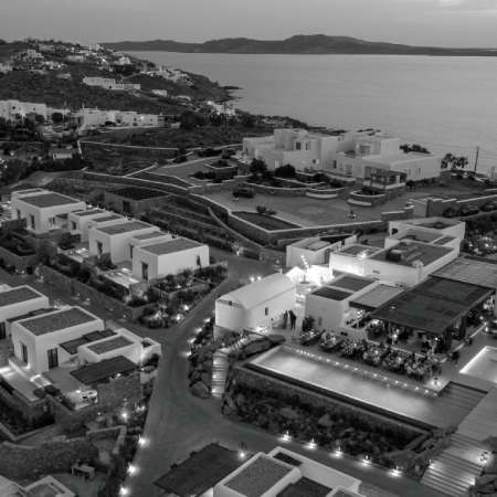 As the sun sets over the island, the scenery changes revealing a magical tapestry of hues. With a refreshing cocktail from Pere Ubu Mykonos’ Bar venture to the hotel’s Aloni Sunset Lounge - a warm, inviting fire pit, perfect for evening relaxation, and socializing.